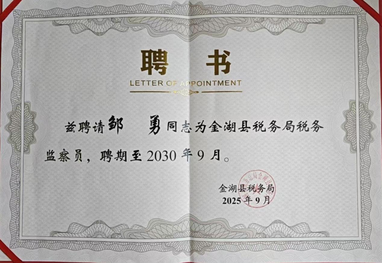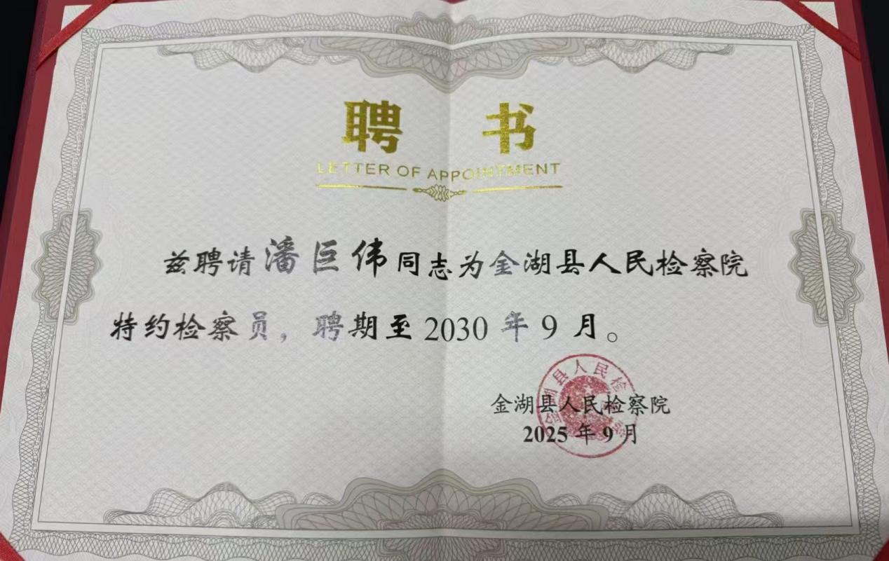 首批聘任单位是金湖县监委、法院、检察院、审计局,税务局等九家单位。全县一共聘任了18名特约人员,其中淮安市民建金湖县支部就有4名会员被聘任。金湖支部副主委邹勇被县税务局聘任为“税务监察员”,支部支委何在祥被金湖生态环境局聘任为“特约监督员”,支部支委潘巨伟和支部会员陈斌被县检察院聘任为“特约检察员”,聘期五年。