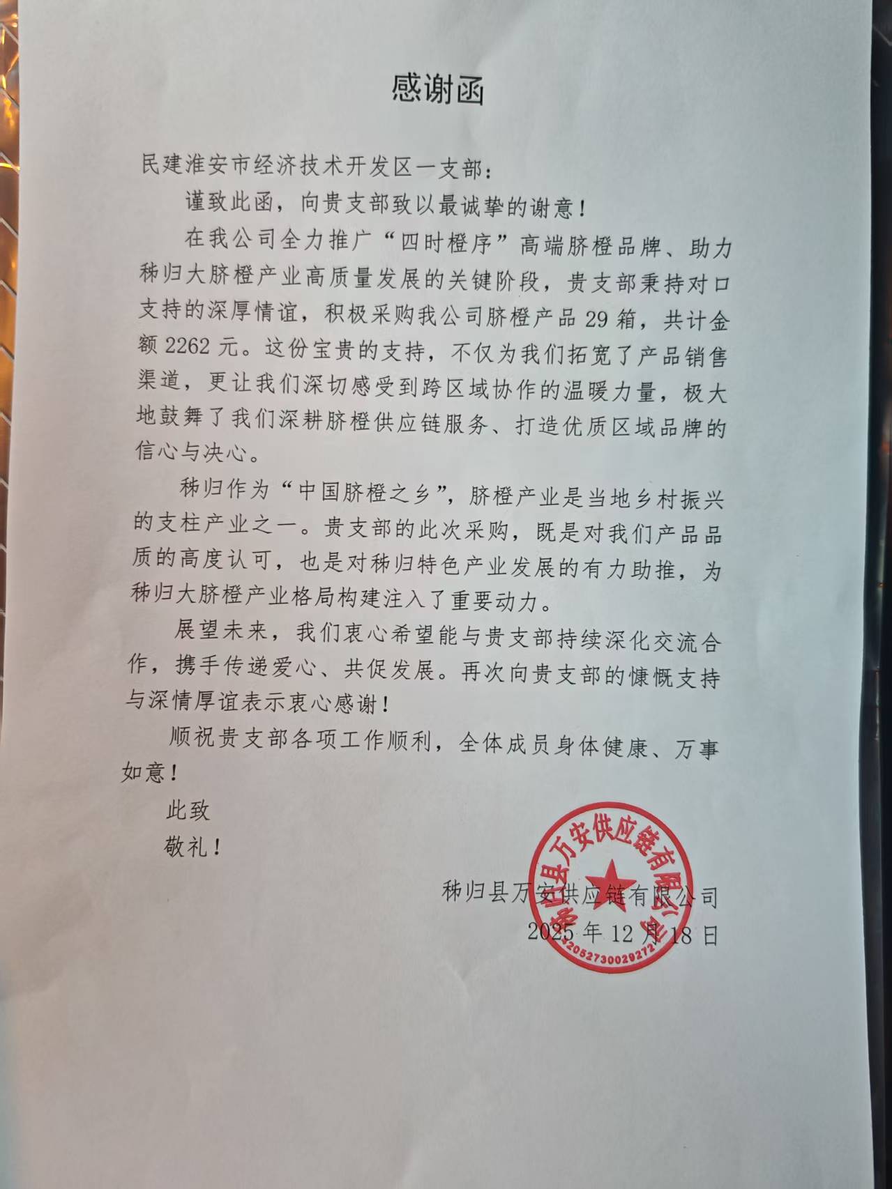 近日,民建淮安经济技术开发区一支部(以下简称“民建经开区一支部”)收到一封来自湖北省宜昌市秭归县的感谢函。这封跨越千里的来信,不仅承载着果农的感激,更见证了民建会员助力乡村振兴的拳拳爱心。